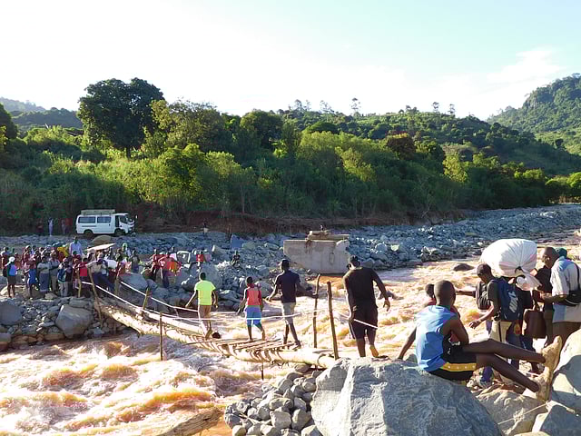 After bridges were washed away during Cyclone Idai, villagers of Chimanimani district use a makeshift structure to cross the river.  Author provided