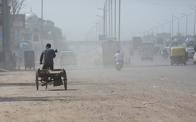 Dust in the air as vehicles commute on a road near Anand Vihar in Delhi.