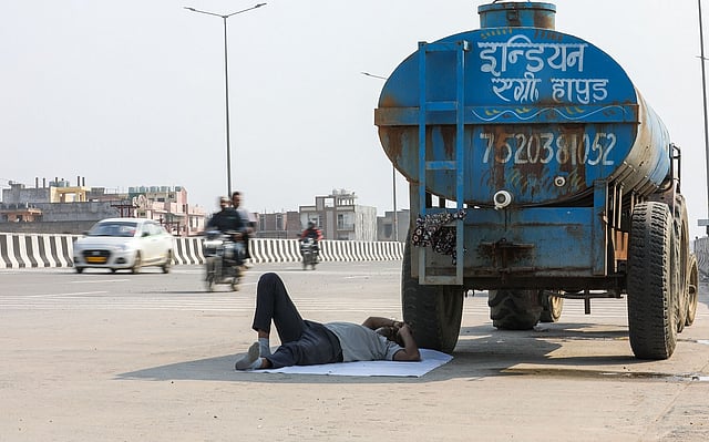 Scorching daytime heat in the metropolis forces outdoor workers and passersby to rest in improvised shelters of shade along busy urban corridors.