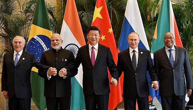 The youngest of the major global alliances is BRICS—Brazil, Russia, India, China and South Africa—representing Europe, Asia and South Africa. While G-7 and G-20 came up in 20th century, the first meeting of BRICS was held in 2006. South Africa joined the alliance in 2010. There five countries have 42 per cent of global population and 22 per cent of global GDP, only 10 per cent of global export and 15 per cent of global import. It has lowest GDP per capita at US $ 5,401. BRICS set up a bank called 'The New Development Bank', in 2015 with a target of setting up of capital investment of USD 50 billion but in 2016 it could only mobilize USD 1 billion and so far it has made no contribution made for climate finance.