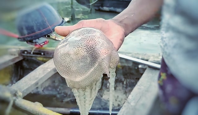 Under normal conditions, each stake net yields 11-18 kg of fish per day. But this has plummeted to 4-6 kg due to jellyfish infestations. At times, a single net traps 40-65 kg of jellyfish.