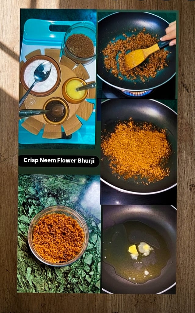 My first taste of dry neem phool bhurji was at my in-laws’ place post-marriage. I wondered whether it was edible. But upon trying, I loved it. Later, I grabbed neem flowers from my mom’s house tree. In summer, we spread a cloth under the tree, collect the dry fallen flowers, clean, and sun-dry them for storage throughout the year. The recipe is quick, tasty, and a powerhouse for skin/hair. It pairs perfectly with dal-chawal, paratha, or anything else. No occasion needed. I make it anytime.