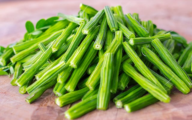 Take a fresh bunch of moringa leaves, about 250-300 grams in weight. Remove the stems, veins, dried leaves, or any unwanted particles, and rinse the leaves thoroughly. Blanch or steam them for about two minutes, then strain and immediately transfer them to cold water. Next, grind the blanched leaves together with peeled garlic cloves, cheese, walnuts or pine nuts/cashews, and a little rock salt. Do not add water, use two to three teaspoons of olive oil to help the grinding process. Blend the mixture to a coarse or smooth consistency, as you prefer. Transfer the pesto into a bowl, mix in the remaining olive oil, and adjust the salt. Store it in a clean glass bottle, pouring a thin layer of olive oil on top to help preserve it for a longer time.