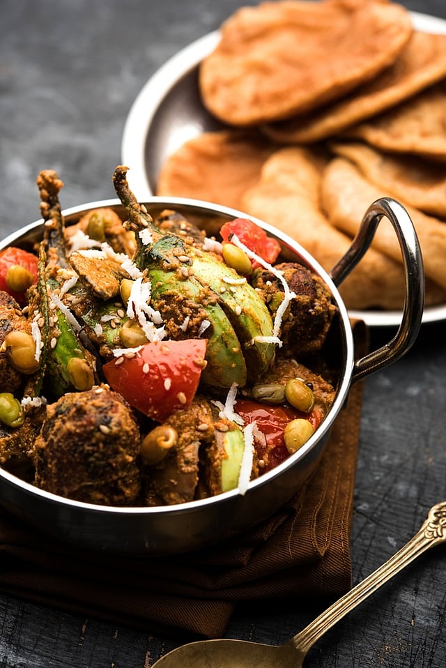 Undhiyu is a traditional Gujarati mixed vegetable dish, cooked mainly in winter using seasonal, plant-based ingredients like brinjals, raw bananas, sweet potatoes, Surti papdi, and methi muthiyas. It is flavoured with a spicy-sweet green masala made of coriander, coconut, garlic, green chilies, sesame, and jaggery. Slow cooked with tempering of mustard, cumin, and fenugreek, Undhiyu is rich, earthy, and best enjoyed with puri or rotis during festivals and family feasts.