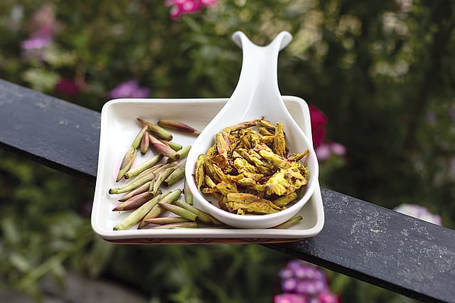 Remove the hard parts of the pilkhan buds. Take some water in a pan, mix in a teaspoon of salt and put it on the gas to boil. Add the buds and cook until they are soft. Drain out the water. Take some oil in a wok and put it on the flame. Add asafoetida and cumin seeds and fry them till they sputter. Add the boiled buds along with chilli powder, coriander powder, turmeric and salt. Mix well. Add the gram flour and mix again and then fry till fully cooked. Enjoy with parathas or rotis.