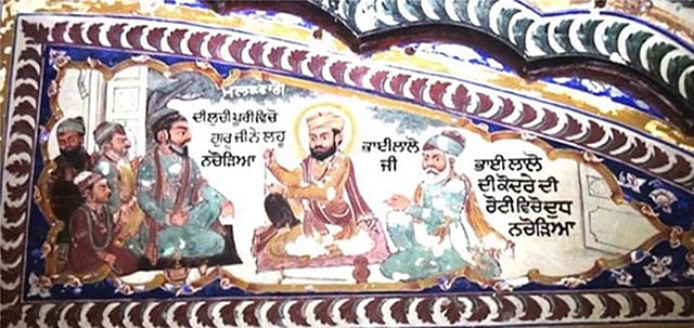 “The tradition relates that while Guru Nanak was staying with this person of low caste a certain Malik Bhago gave a feast to which the Guru was invited. The invitation was, however, refused and eventually Malik Bhago had to resort to constraint. When the Guru was brought to him he demanded an explanation for the refusal. Guru Nanak in reply took in one hand a quantity of Malik Bhago’s rich food, and in the other a piece of Lalo’s coarse bread. He then squeezed both. From Lalo’s bread trickled milk, but from Malik Bhago’s food there issued blood. The point of the miracle was obviously to demonstrate that Lalo’s food had been earned by honest labour, whereas Bhago’s was the product of extortion and oppression,” writes McLeod in his 1968 book, Guru Nanak and the Sikh religion.
