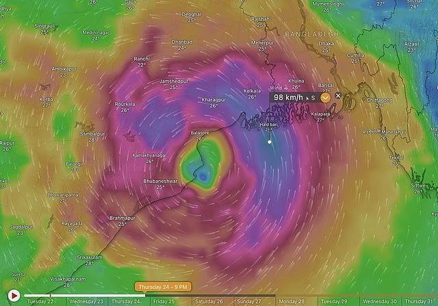 On October 22, the India Meteorological Department (IMD) predicted that the cyclone may turn severe in the early morning hours of October 24 and make landfall between Puri in Odisha and Sagar Islands in West Bengal. The direct distance between the two areas is more than 300 km.