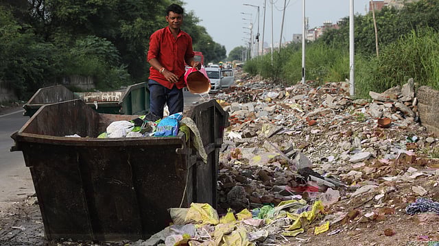 In the first photograph, we see mixed waste lining a road very close to the Ghazipur landfill in the eastern part of the city. What's visible is a combination of construction and demolition waste, along with municipal waste. The collection vessel, that's supposed to be cleared every day, cannot contain the volume of waste that ends up there.