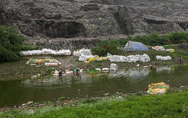 Workers clean gunny bags in a canal flowing below the Ghazipur landfill.