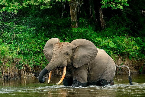 African forest elephants roam the dense rainforests of West and Central Africa where they subsist largely on a diet of fruit. They shape forests by dispersing fruit and seeds, browsing and creating an extensive trail network.