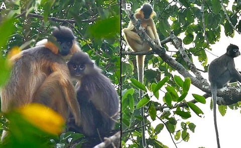 (Left) The hybrid offspring sitting with its capped langur mother; (Right) the probable father (Trachypithecus phayrei) and mother (Trachypithecus pileatus) of the hybrid resting on a tree in a fragmented forest patch of northeast Bangladesh. Photo: Springer Nature