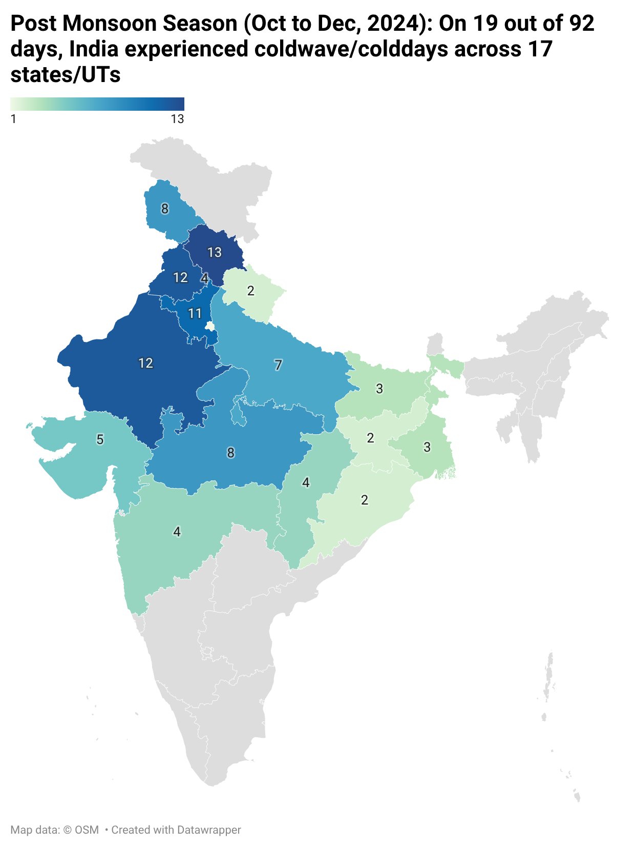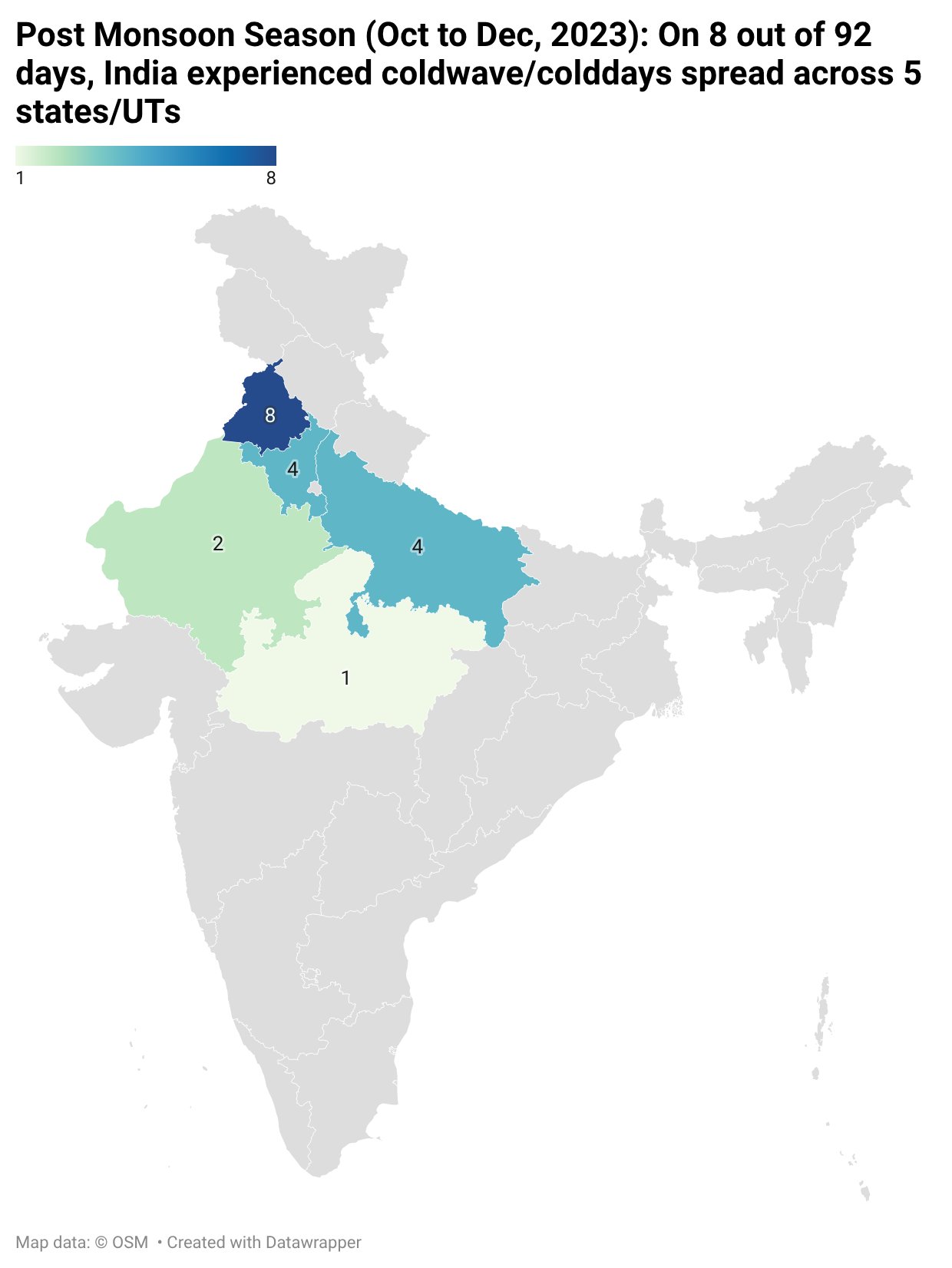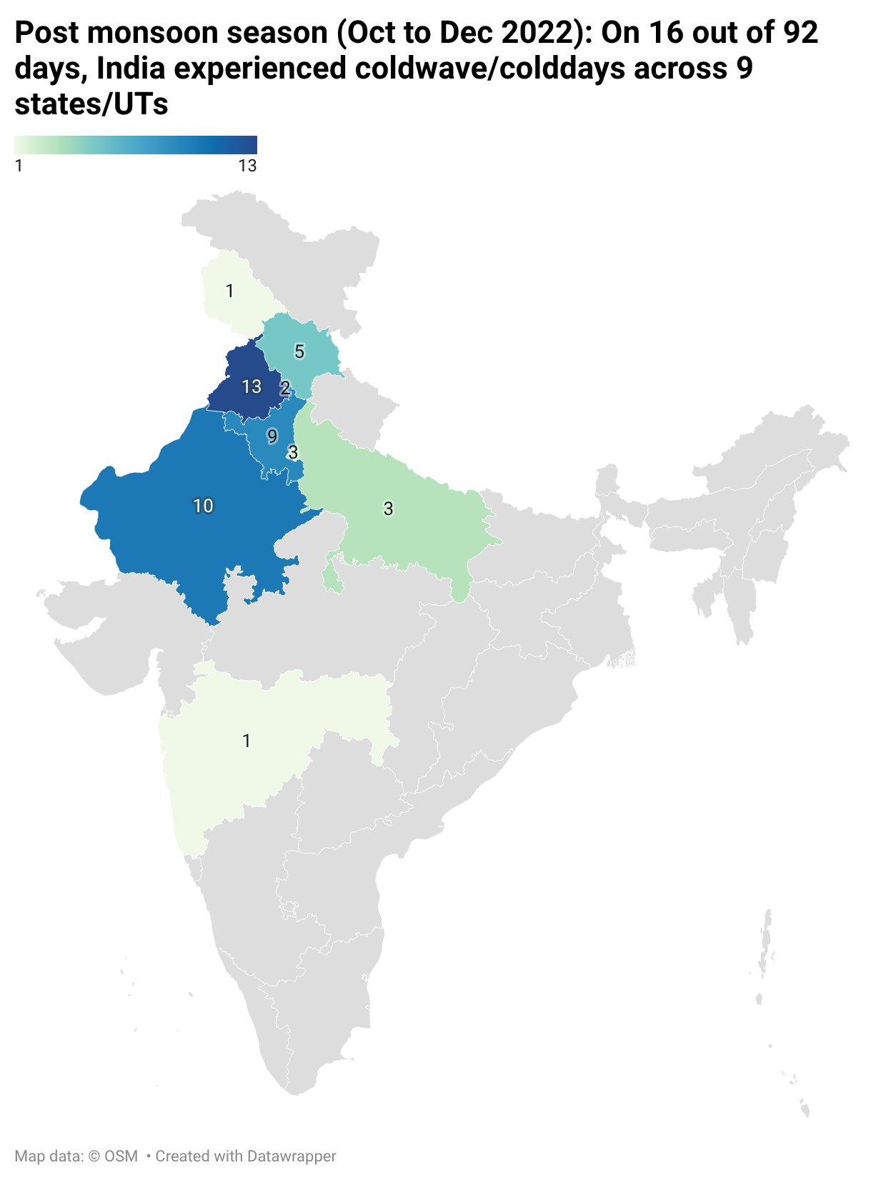In 2022, cold waves were recorded on 30 of 59 winter days across 14 states, with no impact in south or southeast India.