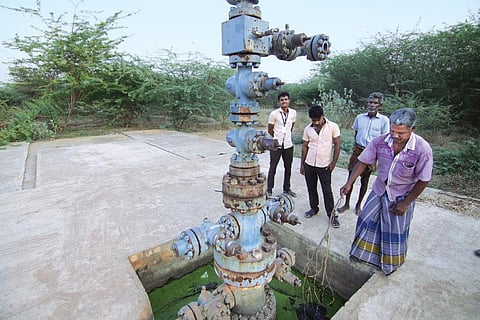 The oil rig stands behind a thicket of trees on an otherwise barren patch of land. A black flag is tied to the top as a sign of protest. “For about 10 years now, Oil and Natural Gas Corporation Limited (ONGC) officials have been running tests on these lands,” says G Madiyakaran, a resident of the village. “We were never informed about their intentions. We were only told that there might be petrol under our land. Now they seem to have found something and the world is telling us that it will be harmful for us, our land and livelihoods.”