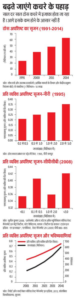 वर्ष 2009 में, आर्थिक कार्य विभाग के ठोस अपशिष्ट प्रबंधन संबंधी स्थिति पत्र में यह बताया गया है कि भारत की शहरी आबादी पहले ही प्रतिदिन 80,000 मीट्रिक टन कचरे का उत्पादन कर रही थी। यह दर्शाता है कि 2047 तक भारत एक वर्ष में 26 करोड़ टन कचरे का उत्पादन करेगा जिसका निस्तारण करने के लिए 1,400 वर्ग किलोमीटर के भराव क्षेत्र की जरूरत होगी। यह क्षेत्र हैदराबाद, मुंबई और चैन्ने को मिलाकर बने क्षेत्र के बराबर होगा।