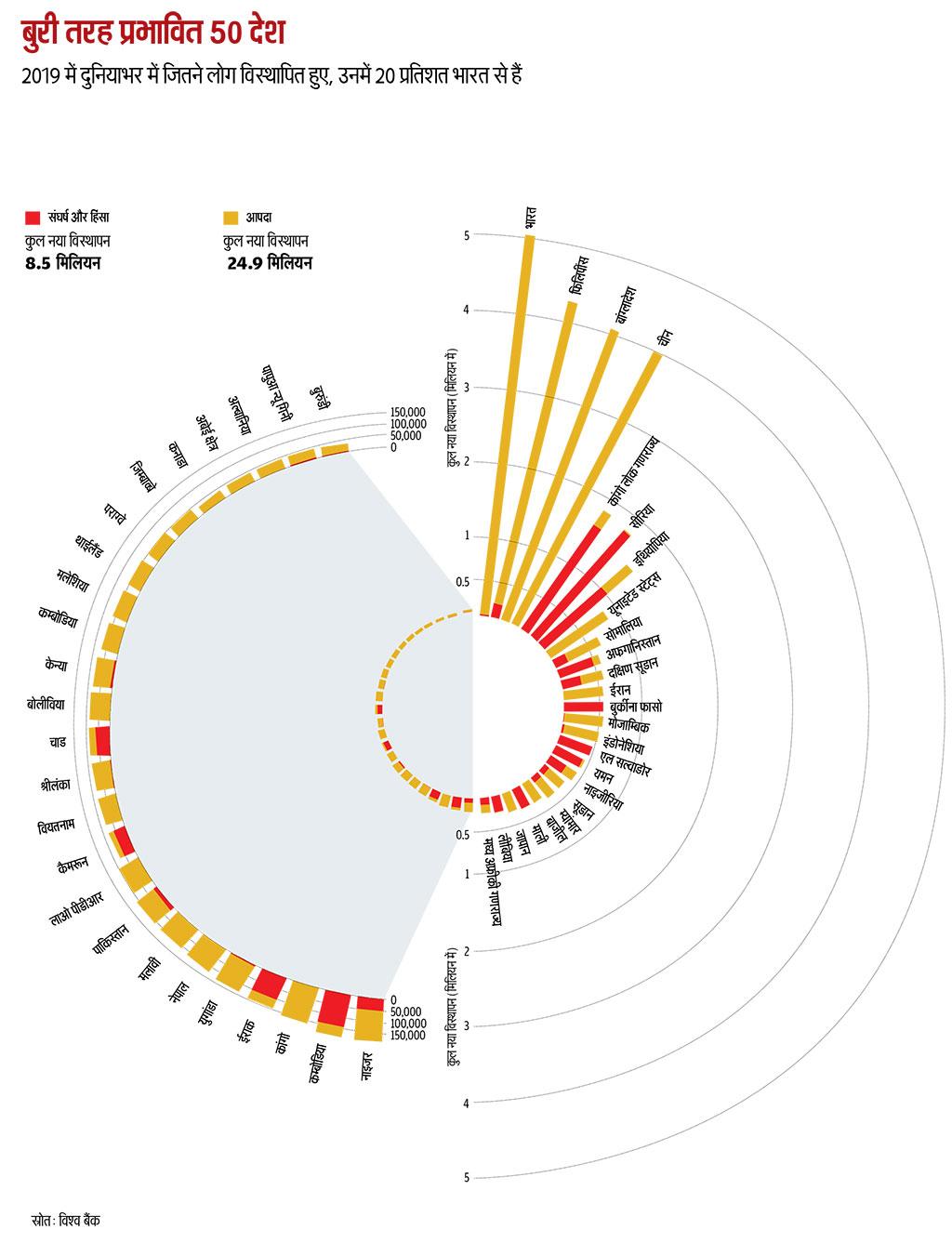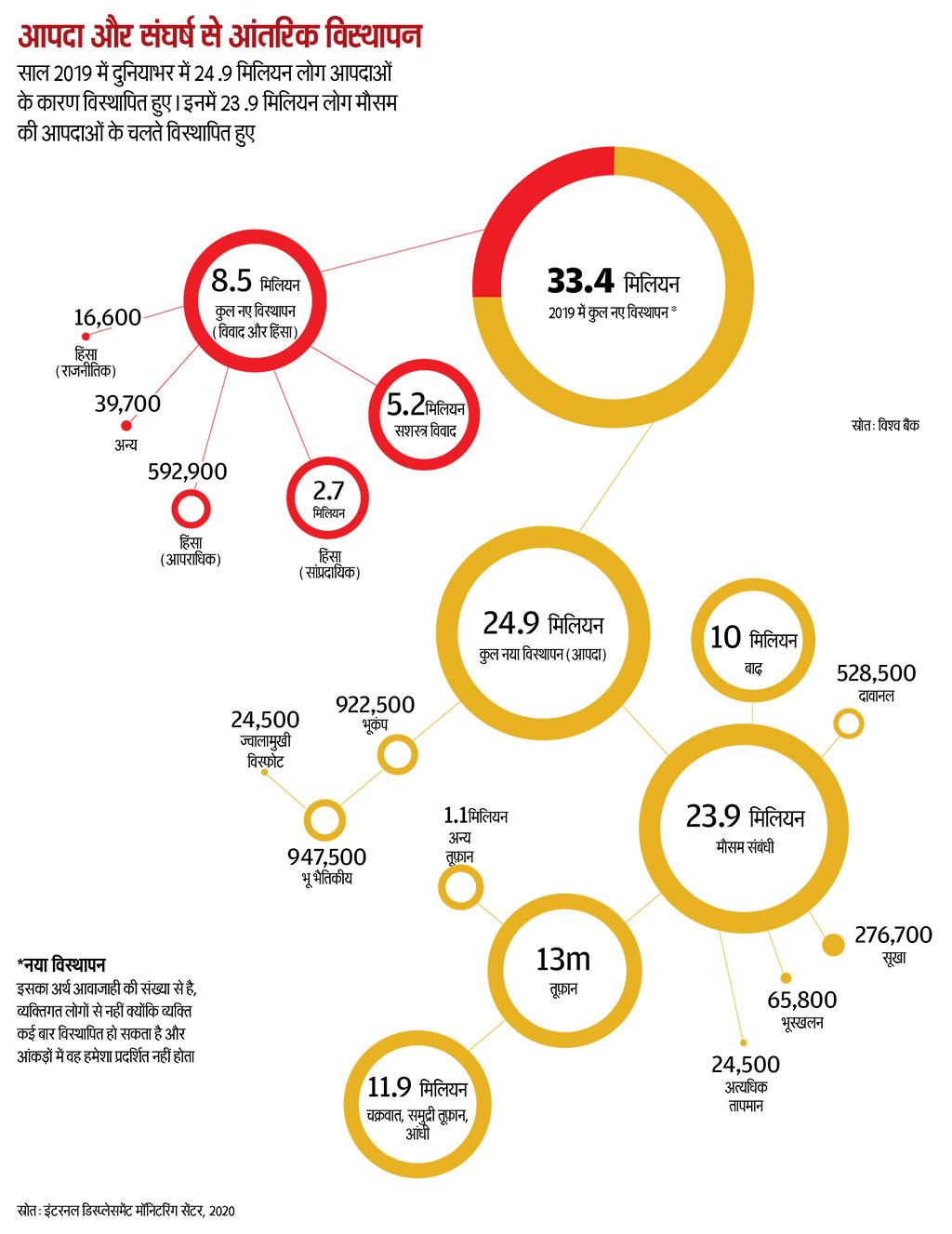 विश्व बैंक का कहना है कि 2019 में दुनियाभर में जितने लोग विस्थापित हुए, उसमें 20 प्रतिशत भारत से हैं। भारत में 50 लाख लोग जलवायु आपदाओं से केवल 2019 में विस्थापित हो गए। 2008-2019 के बीच भारत में हर साल औसतन 36 लाख लोग विस्थापित हुए। इस विस्थापन का बड़ा कारण मॉनसून के दौरान आई बाढ़ रही है लेकिन इस दौरान चक्रवात भी विस्थापन का एक प्रबल कारण बनकर उभरा है।