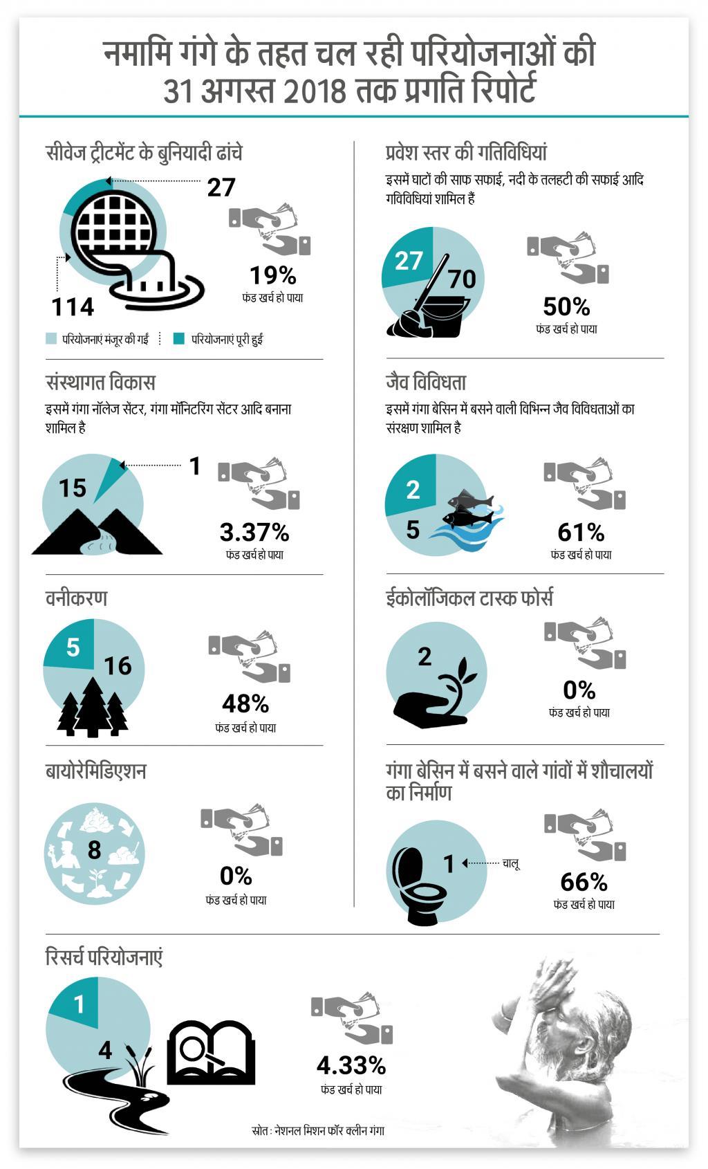 जहां तक सीवेज इंफ्रास्ट्रक्चर परियोजनाओं की बात है, 13 मई 2015 को केंद्रीय कैबिनेट द्वारा नमामि गंगे को मंजूरी मिलने के बाद 68 परियोजनाएं मंजूर की गई थीं। केवल छह परियोजनाएं 31 अगस्त 2018 तक पूरी हुई हैं। नमामि गंगे के गठन से पहले स्वीकृत 46 लंबित परियोजनाओं में से केवल 21 पूरी हो पाई हैं। गौरतलब है कि नमामि गंगे से पहले राष्ट्रीय गंगा नदी बेसिन अथॉरिटी (एनआरजीबीए) अस्तित्व में थी और इसी के तहत गंगा सफाई कार्यक्रम चल रहा था। नमामि गंगे के आने के बाद, एनआरजीबीए की सभी परियोजनाओं को नमामि गंगे कार्यक्रम में स्थानांतरित कर दिया गया था।
