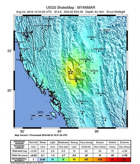 The epicentre of the quake was located 25 km west of the town Chauk in Myanmar. The depth of the quake was intermediate at 84.1 km under the surface.