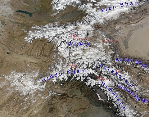 The High Mountain Asia Region consists of major mountain ranges or chains such as the Himalayas, Hindu Kush, Pamirs, Karakoram and Kunlun Shan Credit: Wikimedia