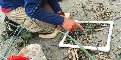 He squats in the sand, rolls back a fire-log-size chunk of driftwood with gloved hands, and scrapes back a tuft of beach wrack on the sand beneath it — a mix of green eelgrass and bits of red algae, sprinkled with twigs and leaves; a fertile meeting of land and sea.