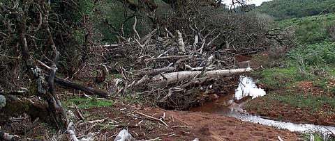 Gone are the rich black soil layers topped with spongy humus that line the streams; washed away are the dark moss and wild balsam covered rocks that shaped the flow of every stream; lost are the thousands of shola trees, dwarf bamboo and forest kurinji (shrubs of blue flowers which covered the hills) that guarded the streams, saplings, ferns and orchids of the forest floor.