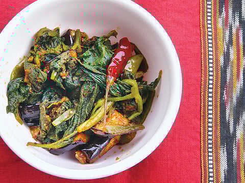 Pare the leaves off the stalk. Keep the leaves whole and chop up the tender stalks. Rinse well and drain. Heat oil in a wok or a heavy bottomed pan. Fry chopped brinjal in hot oil till they turn golden. Remove with a slotted spoon and keep aside. Add a generous pinch of asafoetida to the remaining hot oil, and then the leaves, chopped stalks and red chillies. Stir. Add the remaining ingredients and mix well. Cover and cook on a medium flame for five minutes. Remove the lid and cook for another five minutes, stirring occasionally. Add the brinjal and stir gently. Cook for a few minutes till the stalks are tender, but not mushy. Serve with steamed rice. |