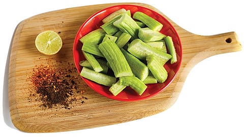 Slit the fruit length wise and cut them into medium-sized pieces. Sprinkle chaat masala and salt. Squeeze half a lemon and consume immediately Kakdi SabjiIngredients