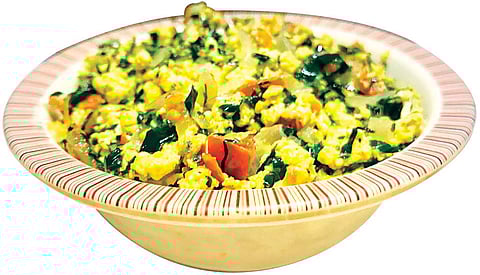 Grind the coconut, cumin and green chillies into a coarse paste. Mix cabbage, onions, tree spinach and the spices; add the paste to it and mix. Heat oil; splutter mustard seeds; and add the mixed ingredients. Sprinkle some water on it and cook on low flame with the lid closed. Keep stirring until soft. This Kerala-style thoran tastes best with rice. Scrambled eggs with tree spinach toppingsIngredients