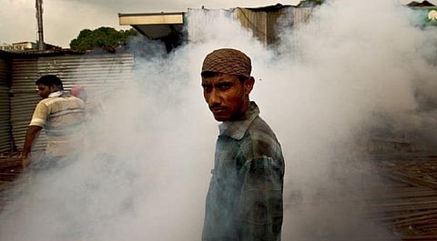 At a construction site in New Delhi, workers are exposed to mosquito repellent. Manan Vatsyayana/AFP