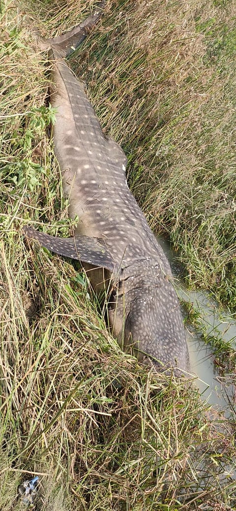The carcass of a whale shark washed ashore December 31, 2020 three kilometres from the coast near the Baradia river mouth in Odisha’s Balasore district, local fishing workers informed forest officials.