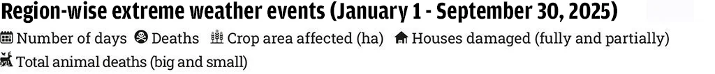 Loss and damage have been assessed under four categories: human deaths, crop area affected, houses destroyed, and animal deaths. While media, IMD and Disaster Management Division reports have been used to ascertain human deaths and crop area affected, the remaining two is sourced only from Disaster Management Division reports, which are available only for the monsoon months. As a result, the data for the two parameters for Jan-May is not included in the report.