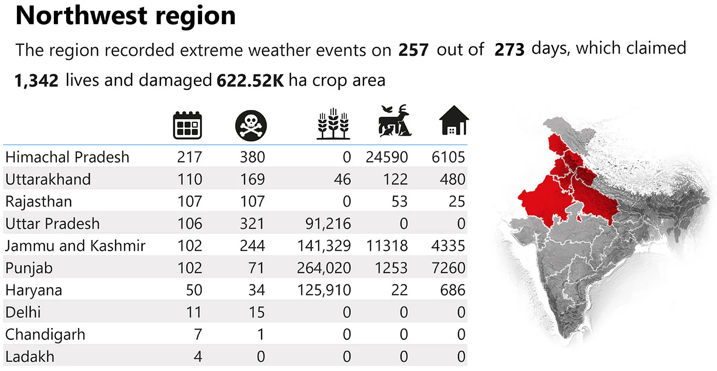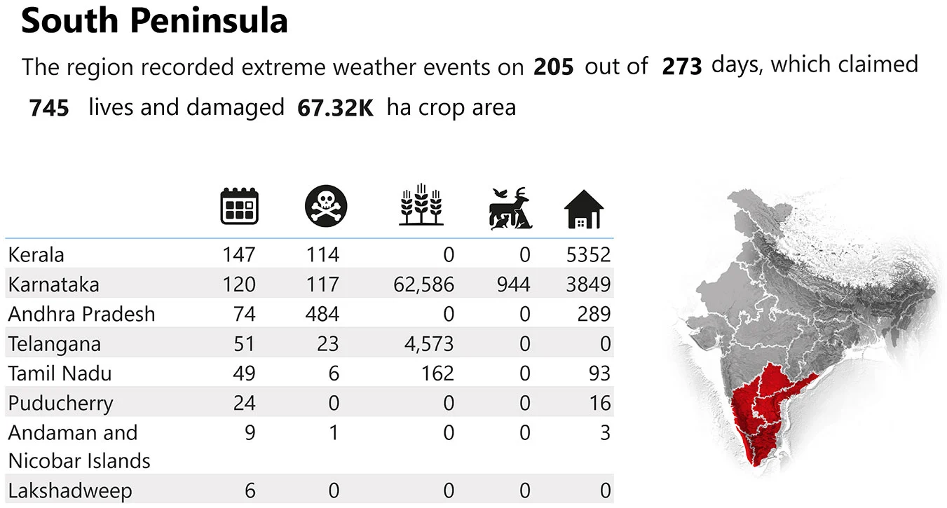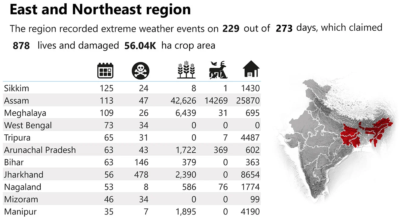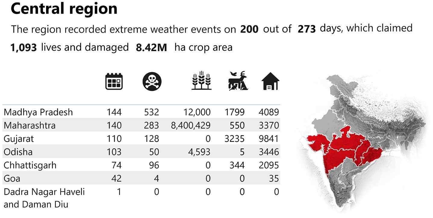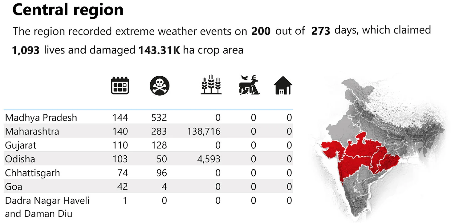 It has quantified the number of extreme weather event days and not the number of extreme weather events. Loss and damage, however, have been quantified month-wise because of the unavailability of data. Loss and damage are also calculated state-wise and not event-wise. This was done because a state has reported two extreme weather events on many days, but the associated loss and damage information is not consistently available.
