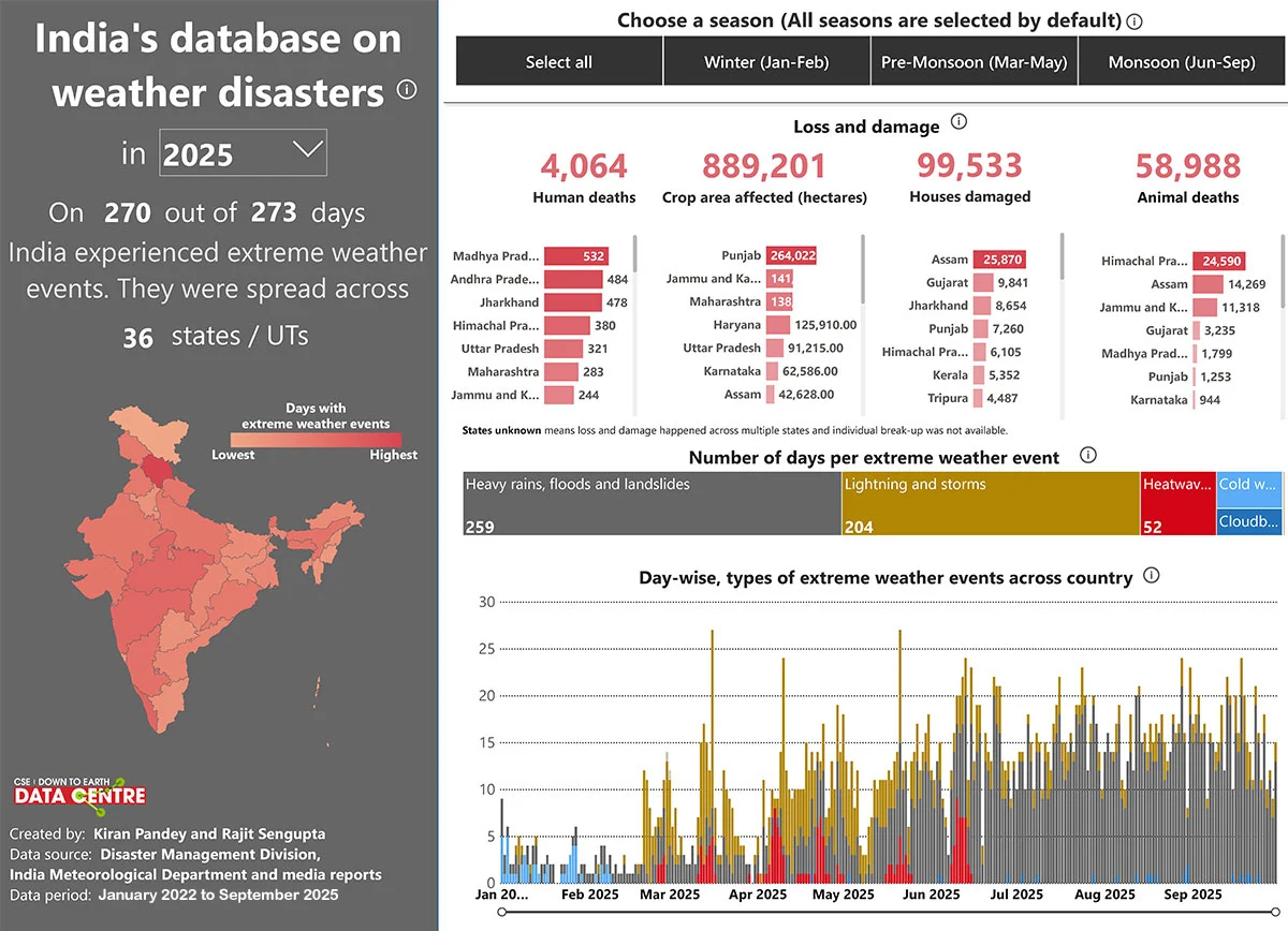 The main objective of the database is to establish the frequency and geographical spread of extreme weather events in India and to quantify the loss and damage due to them. It is based on publicly available data sourced from government sources and media reports.